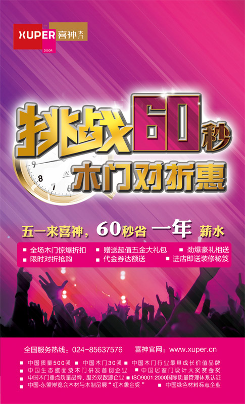五一劳动节,喜神大放“价”! 4月21日起,喜神以品牌的力量在全国范围内发起“挑战60秒,木门对折惠”的极限抢购活动!限时5.1折疯狂抢购,只要进店即有好礼相送,全场8.5折还送高档五金,满额即送高档五金代金券更有机会享受红运当头大奖。全程放“价”有“礼”,等你来挑战!